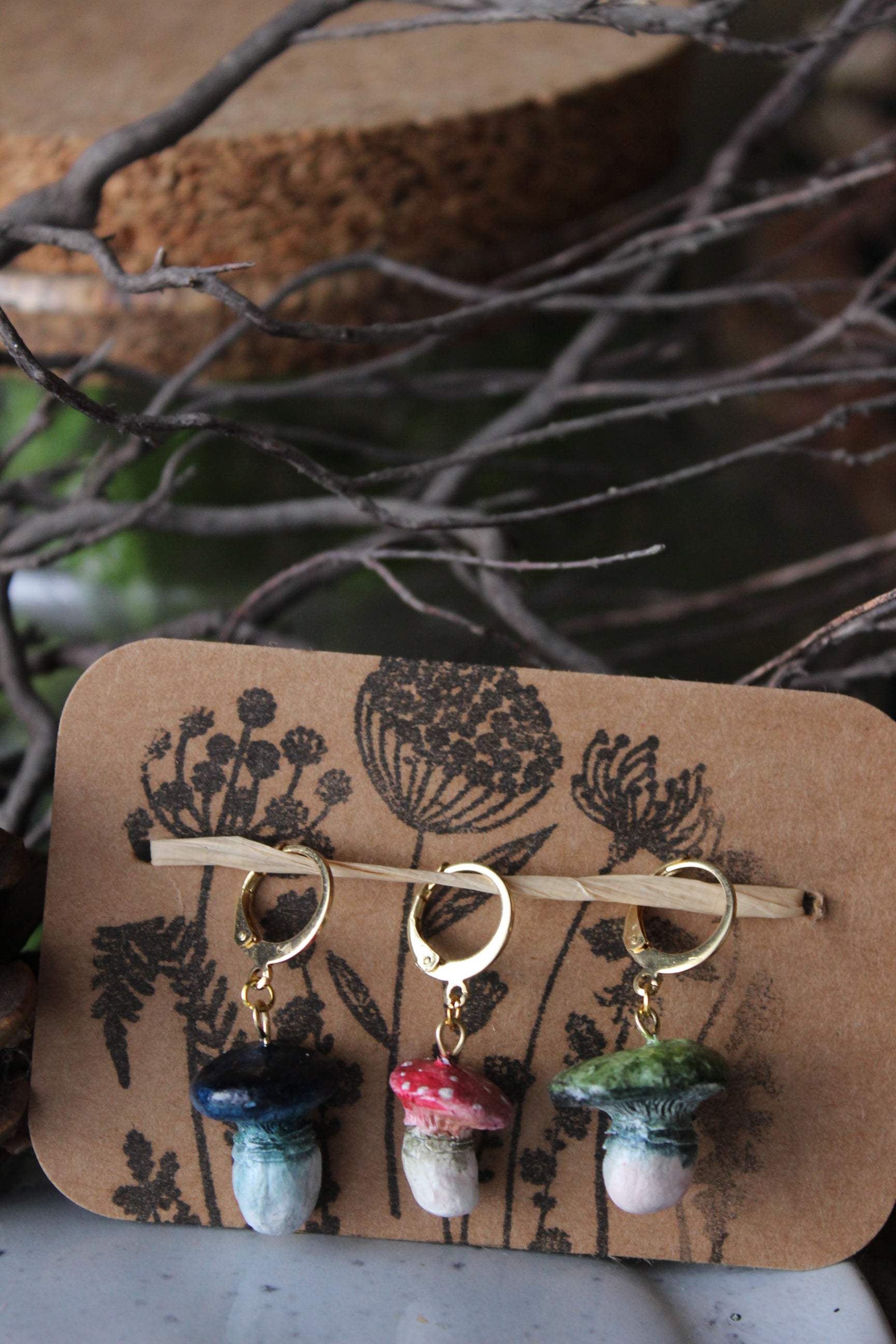 This set of 3 hand shaped Mushroom Stitchmarkers, is made from Airdry clay, painted with waterbased Acrylic paint and then glazed with a non-toxic and water repellent sealant. Jump rings are made from 12mm gold plated metal alloy.
