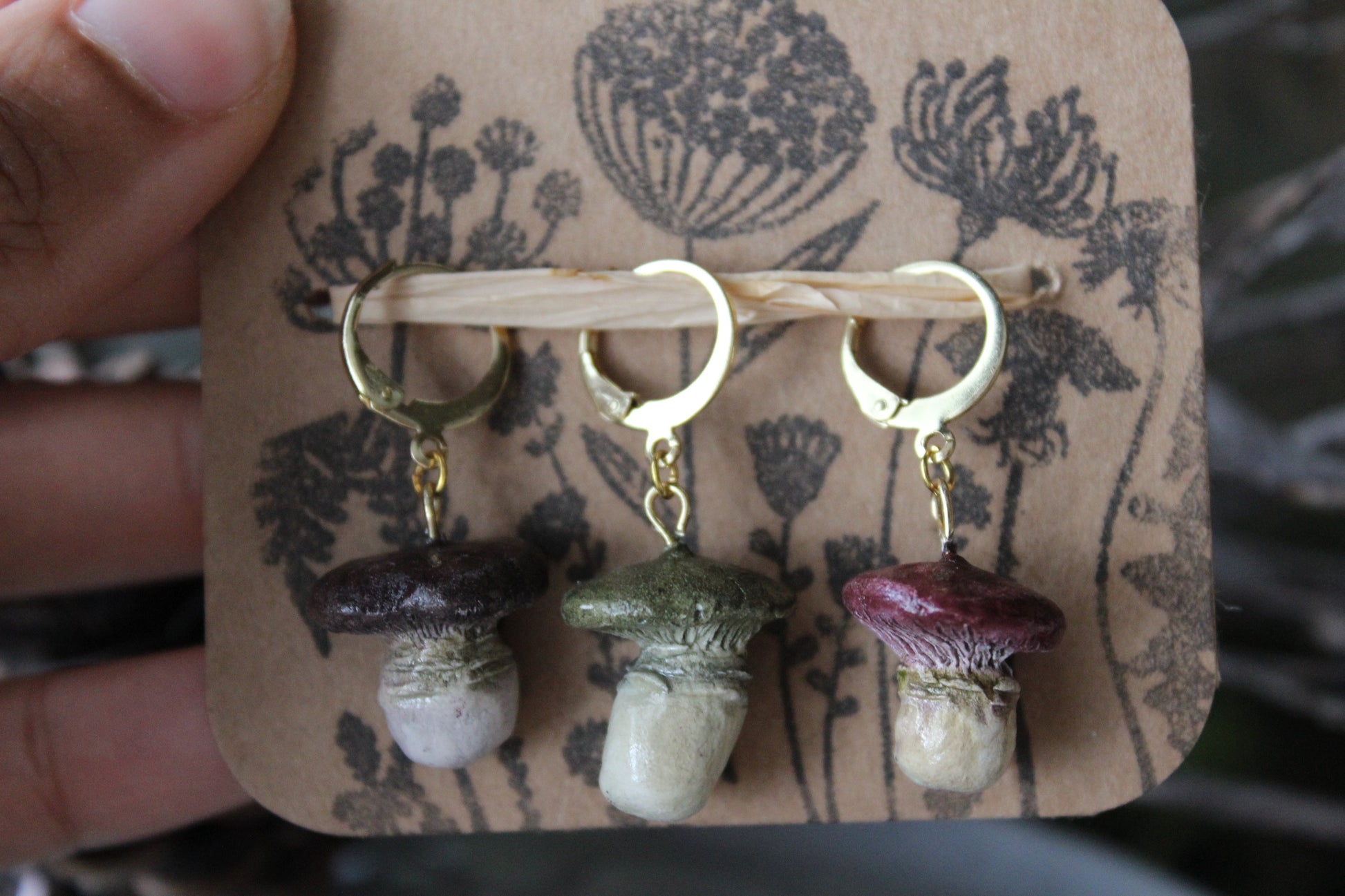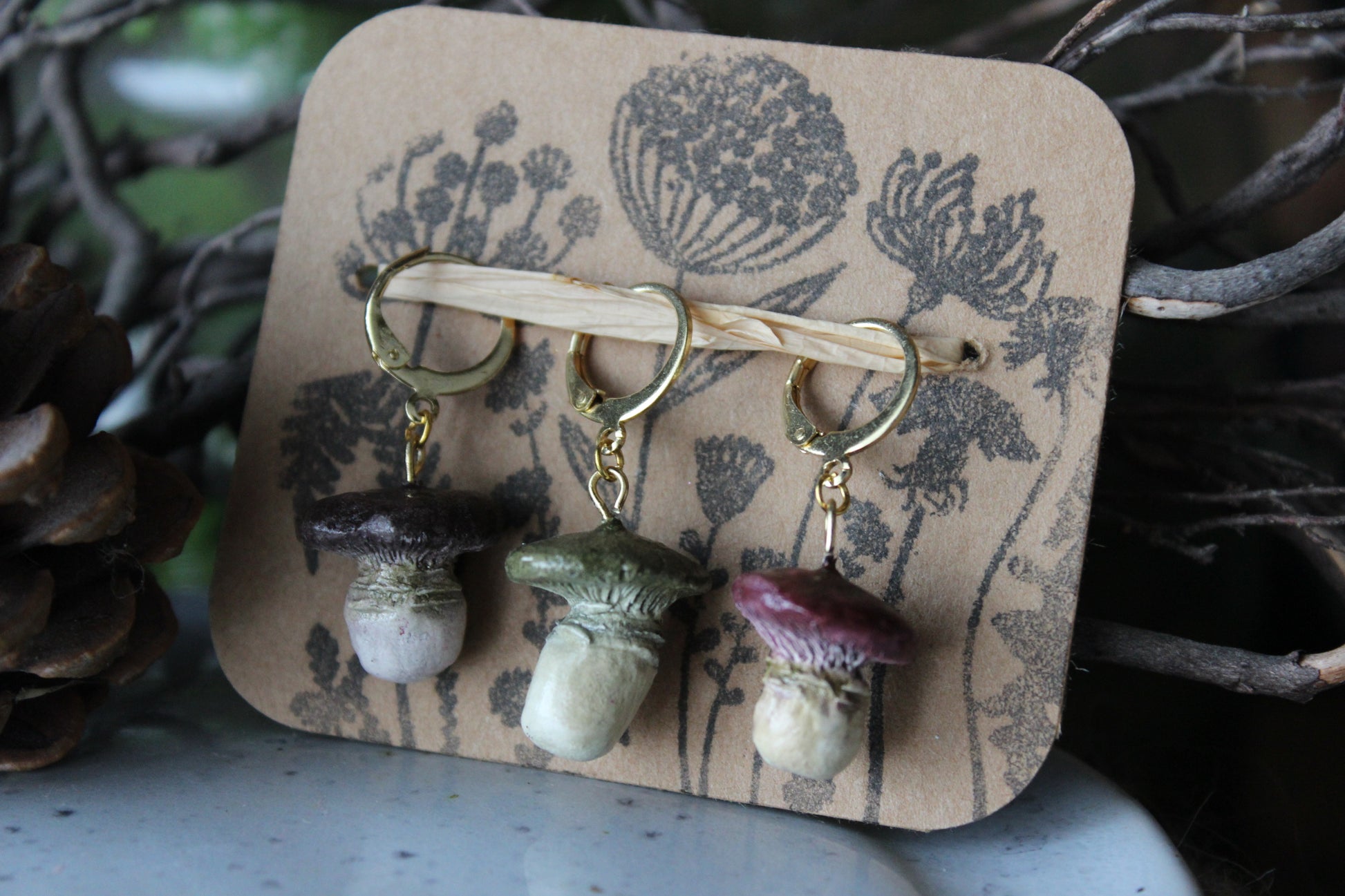 This set of 3 hand shaped Mushroom Stitchmarkers, is made from Airdry clay, painted with waterbased Acrylic paint and then glazed with a non-toxic and water repellent sealant. Jump rings are made from 12mm gold plated metal alloy.