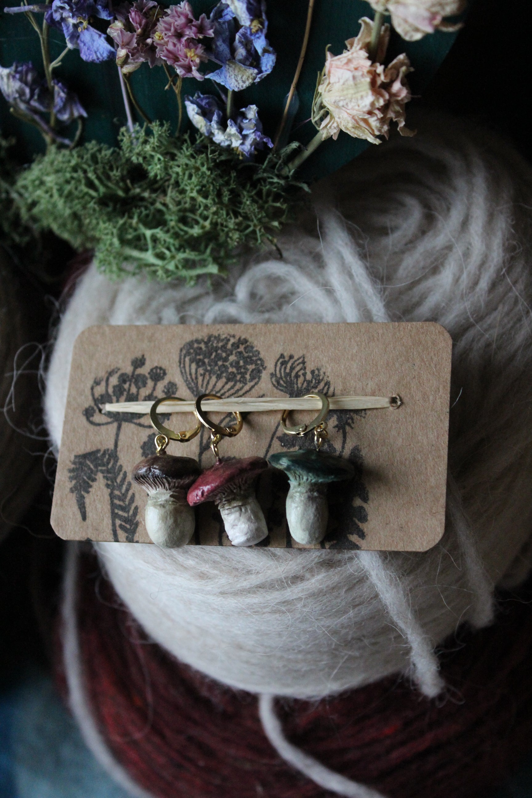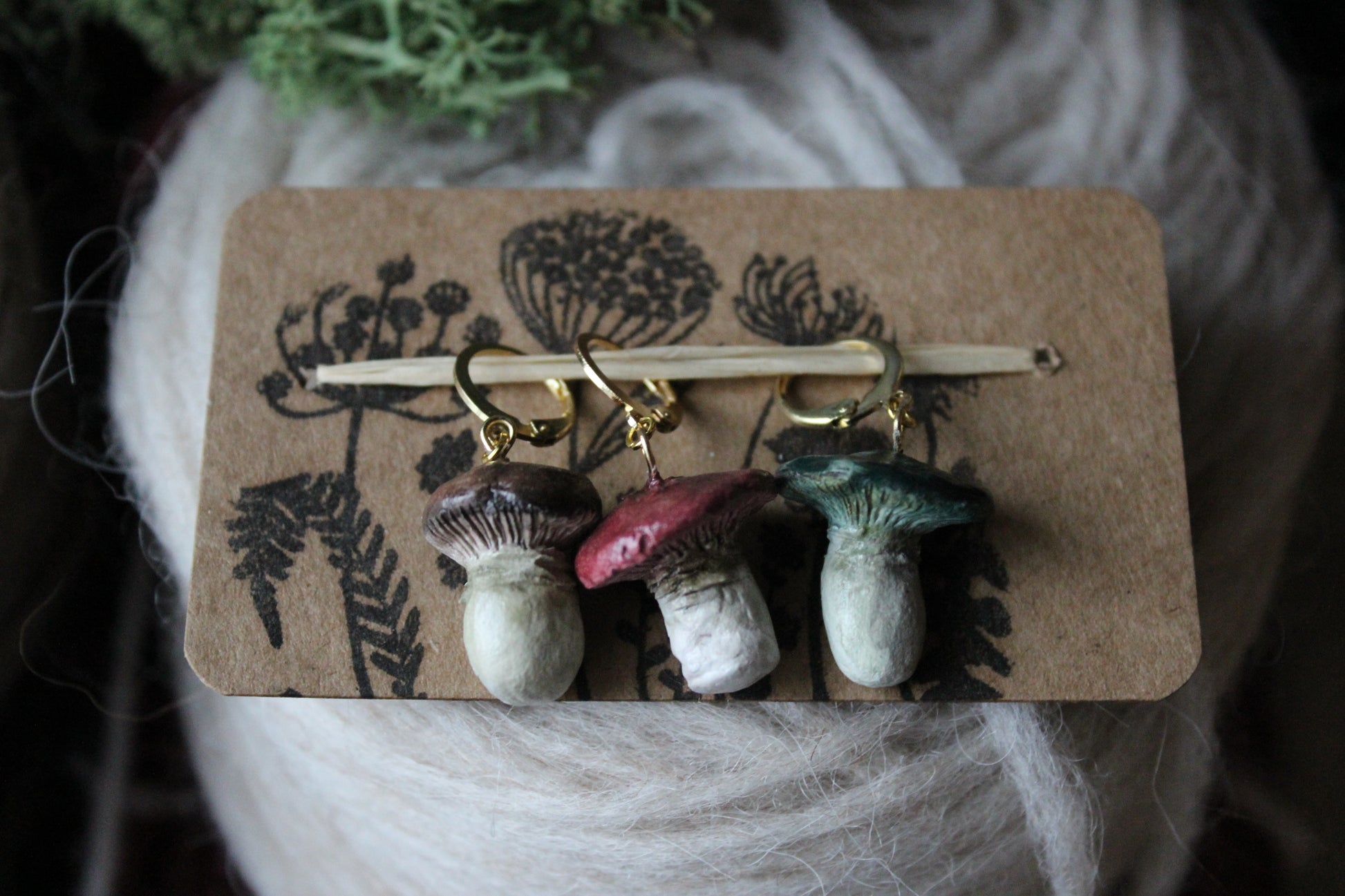 This set of 3 hand shaped Mushroom Stitchmarkers, is made from Airdry clay, painted with waterbased Acrylic paint and then glazed with a none toxic and water repellent sealant. Jumprings are made from 12mm gold plated metal alloy.