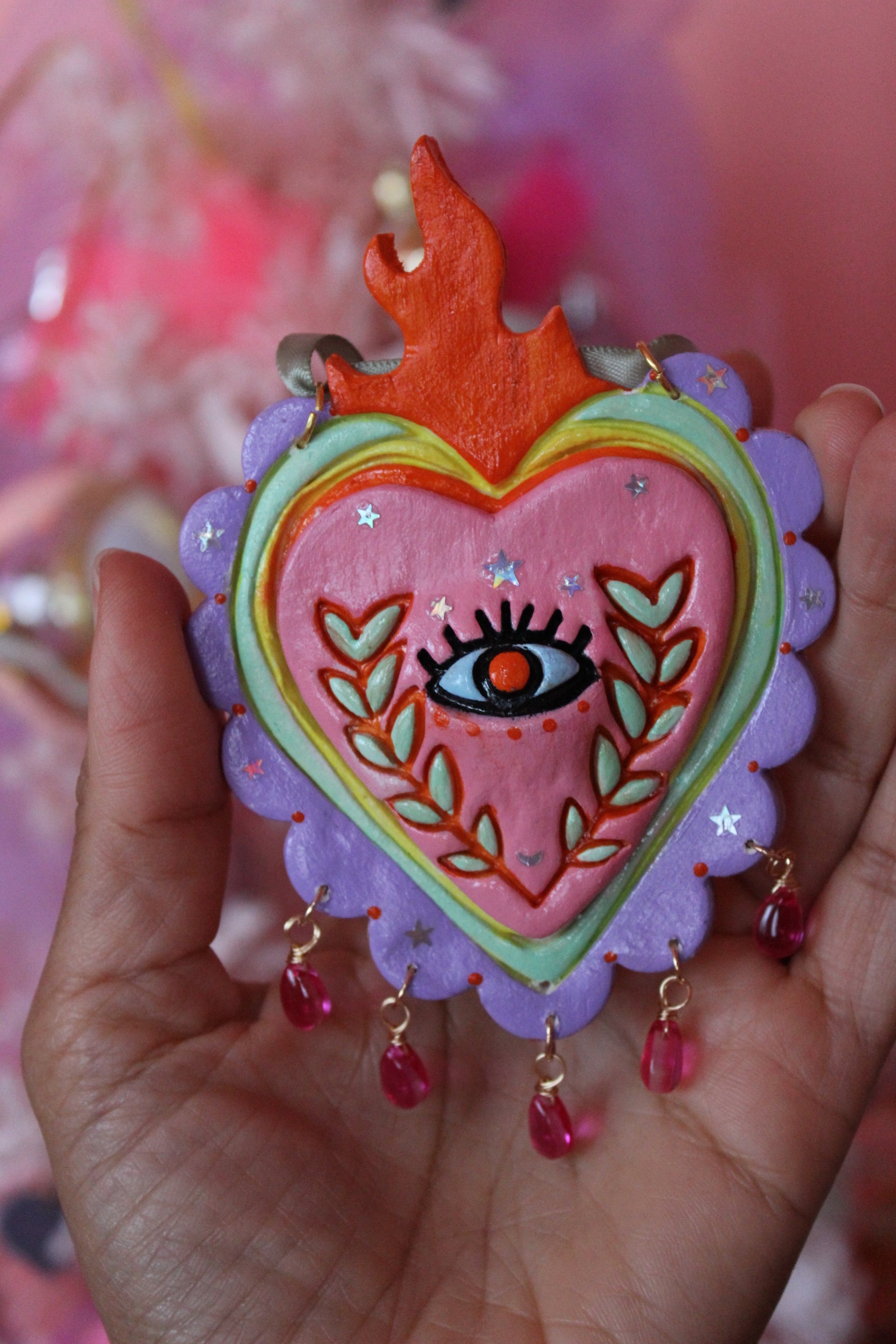 This Sacred Heart Ornament is made from Air dry clay, painted with waterbased Acrylic paint and then glazed with a non-toxic and water repellent sealant.
