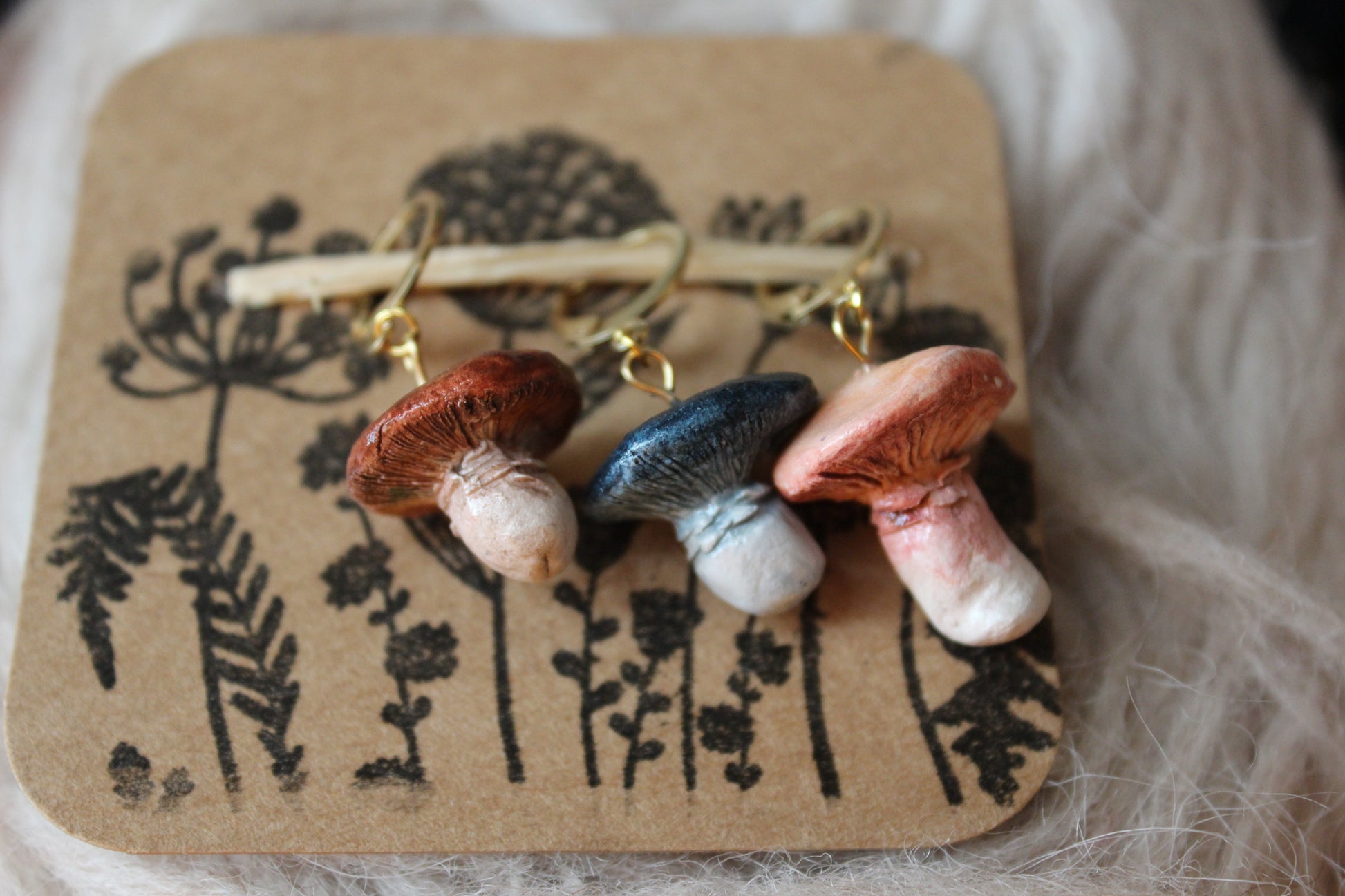 This set of 3 hand shaped Mushroom Stitchmarkers, is made from Airdry clay, painted with waterbased Acrylic paint and then glazed with a none toxic and water repellent sealant. Jumprings are made from 12mm gold plated metal alloy.