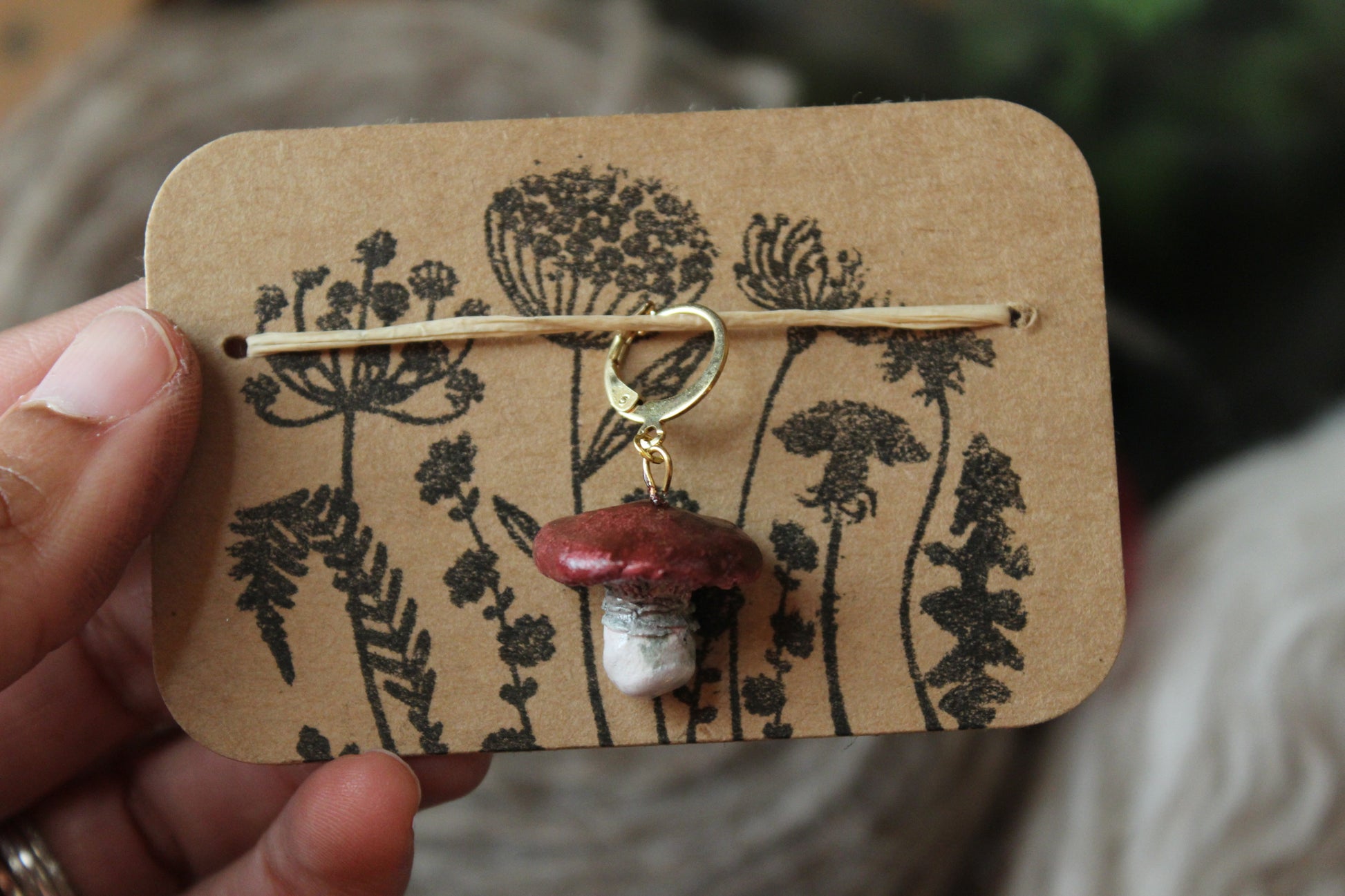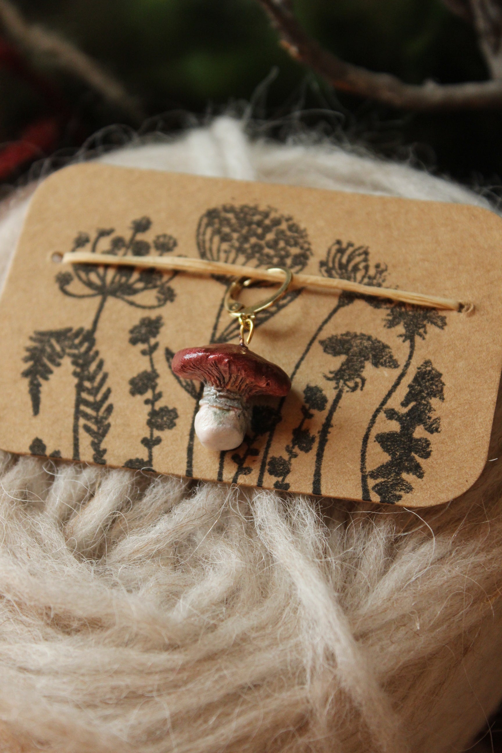 This hand shaped Mushroom Stitchmarker is made from Airdry clay, painted with waterbased Acrylic paint and then glazed with a none toxic and water repellent sealant. Jumprings are made from 12mm gold plated metal alloy.
